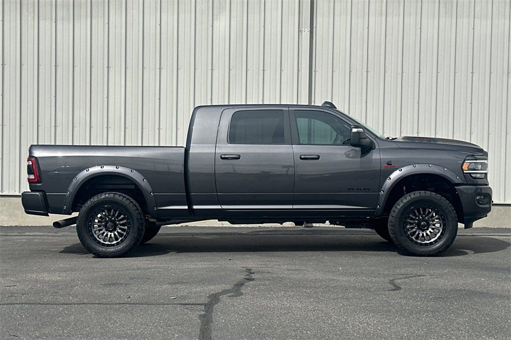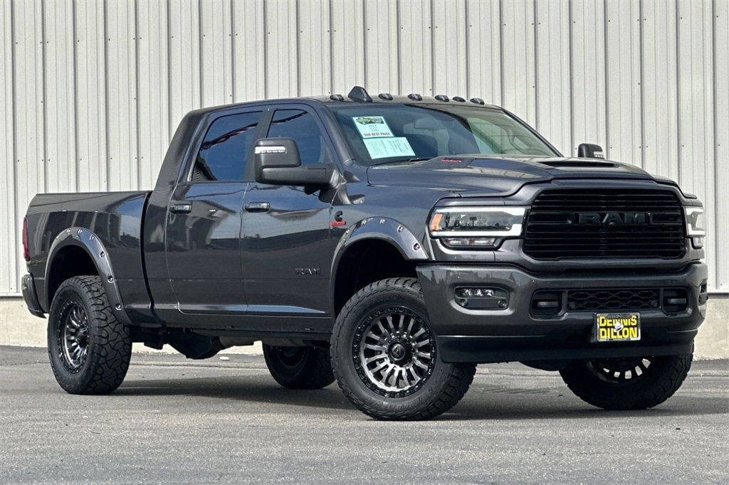 10 Speakers, 115V Auxiliary Rear Power Outlet, 12 Touchscreen Display, 18 x 8 Polished Aluminum Wheels, 2 Way Rear Headrest Seat, 220 Amp Alternator, 3.73 Axle Ratio, 4 Way Front Headrests, 4-Wheel Disc Brakes, 4G LTE Wi-Fi Hot Spot, 5th Wheel/Gooseneck Towing Prep Group, ABS brakes, Active Noise Control System, Air Conditioning, Alexa Built-In, Alloy wheels, AM/FM radio: SiriusXM with 360L, Apple CarPlay, Apple CarPlay/Android Auto, Auto Adjust In Reverse Exterior Mirrors, Auto Dim Exterior Mirror, Auto Dimming Exterior Passenger Mirror, Auto High Beam Headlamp Control, Auto Level Rear Air Suspension, Auto Power-Folding Mirrors, Auto-dimming Rear-View mirror, Automatic temperature control, Black Exterior Mirrors, Black Exterior Truck Badging, Black Headlamp Bezels, Black Interior Accents, Black Ram Head Tailgate Badge, Black Tail Lamp Bezels, Black Wheel Center Hub, Blind Spot & Cross Path Detection, Body Color Grille Surround, Brake assist, Bumpers: body-color, Center Hub, Center Stop Lamp w/Cargo View Camera, Clearance Lamps, Compass, Connected Travel & Traffic Services, Connectivity - US/Canada, Delay-off headlights, Disassociated Touchscreen Display, Driver door bin, Driver vanity mirror, Dual front impact airbags, Dual front side impact airbags, Electronic Stability Control, Electronically Controlled Throttle, Exterior Mirrors Courtesy Lamps, Exterior Mirrors w/Heating Element, Exterior Mirrors w/Memory, Exterior Mirrors w/Supplemental Signals, Foam Bottle Insert (Door Trim Panel), For Details Visit DriveUconnect.com, For More Info, Call 800-643-2112, Forward & Reverse Utility Lights, Front anti-roll bar, Front Center Armrest w/Storage, Front dual zone A/C, Front LED Fog Lamps, Front License Plate Bracket, Front reading lights, Front Seat Back Map Pockets, Fully automatic headlights, Garage door transmitter, Global Telematics Box Module (TBM), Gloss Black Grille Billets/Accents, Google Android Auto, GPS Antenna Input, GPS Navigation, HD Radio, Heated door mirrors, Heated Front Seats, Heated front seats, Heated Steering Wheel, Heated steering wheel, High Back Seats, Illuminated entry, Integrated Voice Command w/Bluetooth, Laramie Level 1 Equipment Group, Leather steering wheel, Leather Trim 40/20/40 Bench Seat, LED Reflector Headlamps, LED Tail Lamps, Low tire pressure warning, Mirror Running Lights, Navigation System, Night Edition, Occupant sensing airbag, Off-Road Information Pages, Outside temperature display, Overhead airbag, Overhead console, Panic alarm, ParkSense Front/Rear Park Assist System, ParkView Rear Back-Up Camera, Passenger door bin, Passenger vanity mirror, Power 2-Way Driver Lumbar Adjust, Power 2-Way Passenger Lumbar Adjust, Power 8-Way Adjustable Passenger Seat, Power Adjust 8-Way Driver Seat, Power Adjust Mirrors, Power Adjustable Pedals w/Memory, Power door mirrors, Power driver seat, Power Heated Folding Telescopic Mirrors w/Memory, Power passenger seat, Power steering, Power Sunroof, Power Telescoping Mirrors, Power windows, Power-Adjustable Convex Aux Mirrors, Quick Order Package 21H Laramie, Radio data system, Radio: Uconnect 5 Nav w/12.0 Display, Radio: Uconnect 5 Nav w/8.4 Display, Rain Sensitive Windshield Wipers, Rear 60/40 Folding Seat, Rear Power Sliding Window, Rear reading lights, Rear seat center armrest, Rear step bumper, Rear Window Defroster, Remot
