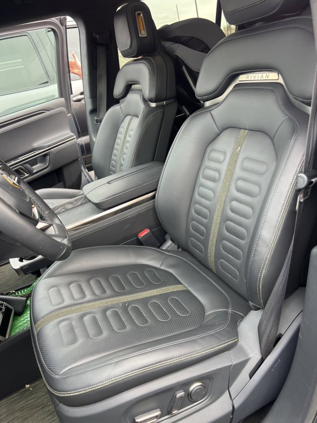 20 Wheels, 3rd row seats: bench, 4-Wheel Disc Brakes, 7 Seat Interior, ABS brakes, Adaptive suspension, Air Conditioning, Alloy wheels, Audio memory, Auto High-beam Headlights, Auto tilt-away steering wheel, Auto-dimming door mirrors, Auto-dimming Rear-View mirror, Auto-leveling suspension, Automatic temperature control, Brake assist, Delay-off headlights, Driver door bin, Driver vanity mirror, Dual front impact airbags, Dual front side impact airbags, Electronic Stability Control, Emergency communication system, Exterior Parking Camera Rear, Four wheel independent suspension, Front anti-roll bar, Front Bucket Seats, Front Center Armrest, Front dual zone A/C, Front fog lights, Front reading lights, Fully automatic headlights, Genuine wood console insert, Genuine wood dashboard insert, Genuine wood door panel insert, Heated & Ventilated Front Bucket Seats, Heated door mirrors, Heated front seats, Heated steering wheel, Illuminated entry, Knee airbag, Low tire pressure warning, Memory seat, Navigation System, Occupant sensing airbag, Outside temperature display, Overhead airbag, Panic alarm, Passenger door bin, Passenger vanity mirror, Perf Vegan Leather Seat Trim w/Patterned Stitching, Power door mirrors, Power driver seat, Power passenger seat, Power steering, Power windows, Radio: Rivian Elevation Audio by Meridian, Rain sensing wipers, Rear air conditioning, Rear anti-roll bar, Rear audio controls, Rear dual zone A/C, Rear fog lights, Rear reading lights, Rear seat center armrest, Rear window defroster, Rear window wiper, Remote keyless entry, Security system, Speed control, Speed-sensing steering, Split folding rear seat, Steering wheel memory, Steering wheel mounted audio controls, Telescoping steering wheel, Tilt steering wheel, Traction control, Trip computer, Turn signal indicator mirrors, Variably intermittent wipers, Ventilated front seats, Wheels: 20 All-Terrain Machined Aluminum.